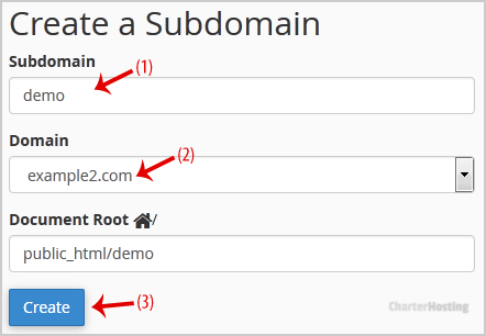 3. Under Create a Subdomain in the Subdomain field you should enter your subdomain name like demo and should you have several domains, select the appropriate domain from the dropdown list.