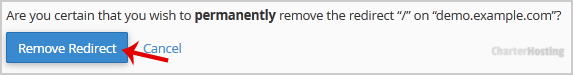 3. Scroll down to the end of the page and under Current Redirects locate the domain and click on the remove icon.