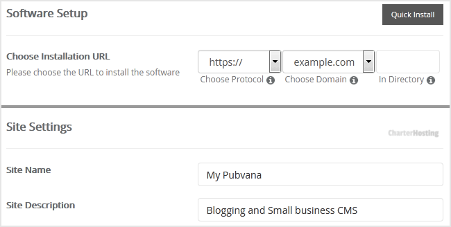 • Choose Installation URL:  Choose the appropriate protocol/domain. Inside the "In Directory" field, should you want to install this in a directory, i.e. example.com/directory, enter the directory name. Otherwise, leave it blank to install in your main domain, i.e. example.com