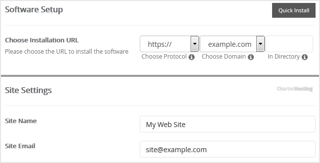 • Choose Installation URL: Choose the appropriate protocol/domain. Inside the "In Directory" field, should you want to install this in a directory, i.e. example.com/directory, enter the directory name. Otherwise, leave it blank to install in your main domain, i.e. example.com